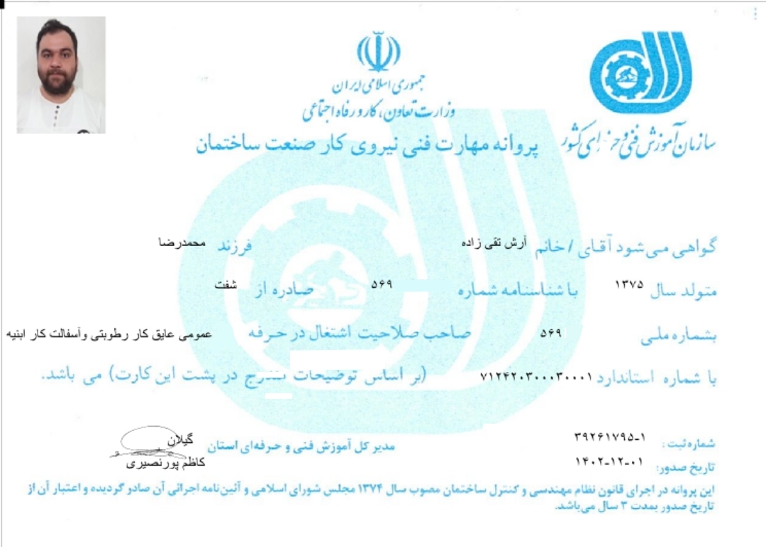 📄دارای گواهینامه پروانه مهارت فنی صنعت ساختمان📄